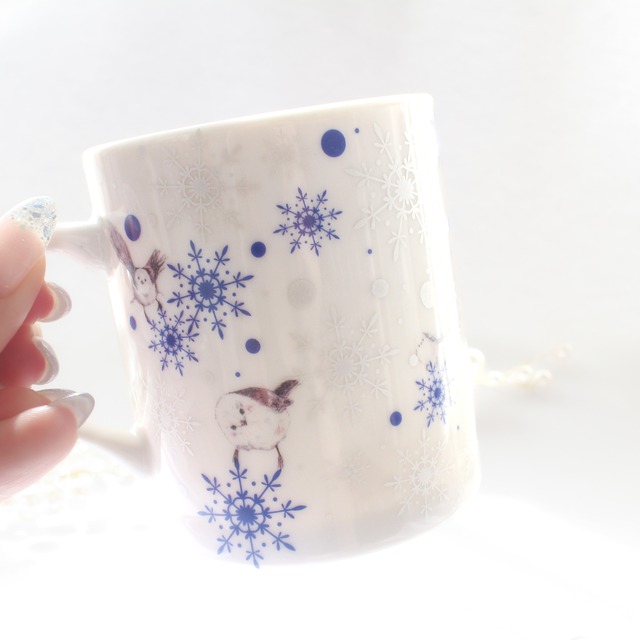 【シマエナガさんと雪の結晶のマグカップ】 〜サイズ〜 高さ9cm 横幅11cm 飲口直径8cm 容量300ml 〜デザイン〜 ブルーとシルバーの雪の結晶が舞う銀世界 シマエナガさんが雪の結晶にとまっている。 幻想的で可愛らしい風景をマグカップに仕上げました。 一つ一つ手作りでお作りしております。 1つのマグカップにシマエナガさんは4匹入っています。大きさポーズはそれぞれ異なります。 全て可愛くお作りしておりますのでご安心くださいませ。 ※食洗機、電子レンジ対応です 〜素材について〜 日本製の美濃焼 白磁と呼ばれる真っ白な陶器に絵付けをして作成しております。 800℃で時間をかけて丁寧に焼いて作成しております。 新品の陶器を使用しておりますが、 磁器特有のピンホールやゆがみ、釉薬のムラ、黒点、小キズ、底の黒ずみ、ザラつきがみられる場合があります。 使用上に問題はございません。ご了承願います。 ୨୧┈┈┈┈┈┈┈┈┈┈┈┈┈┈┈┈┈┈୨୧