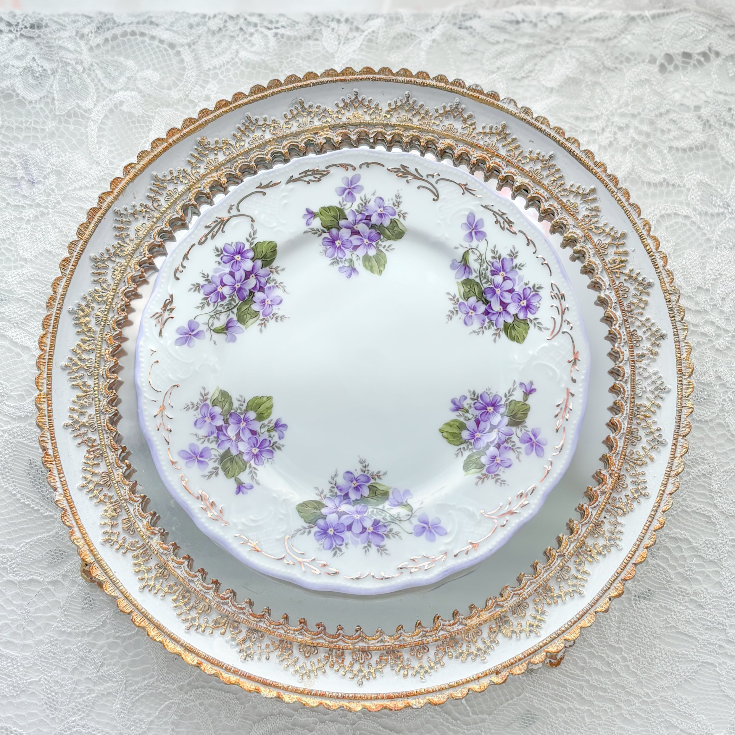 デコラティブなお皿に紫のすみれが優雅に咲き誇ります。