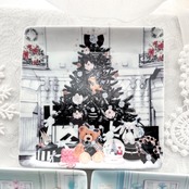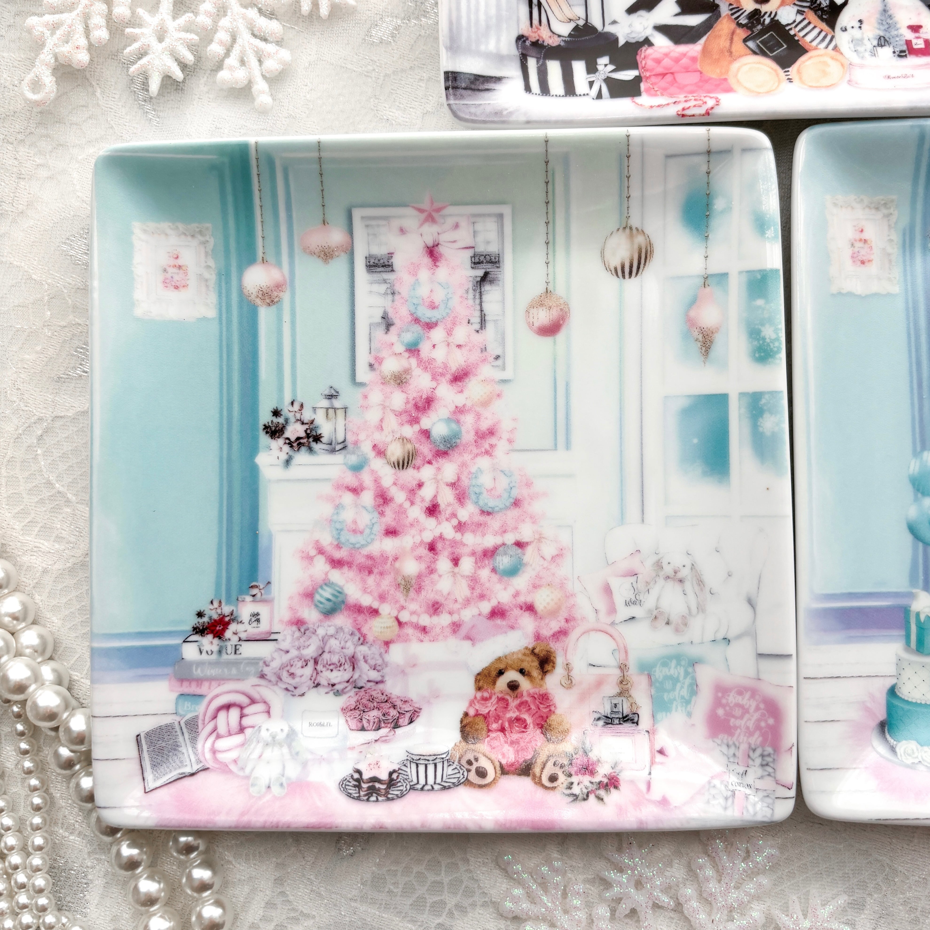 優しい色合いのクリスマスツリーと、くまさんたちの世界を描いたスクエアプレート。