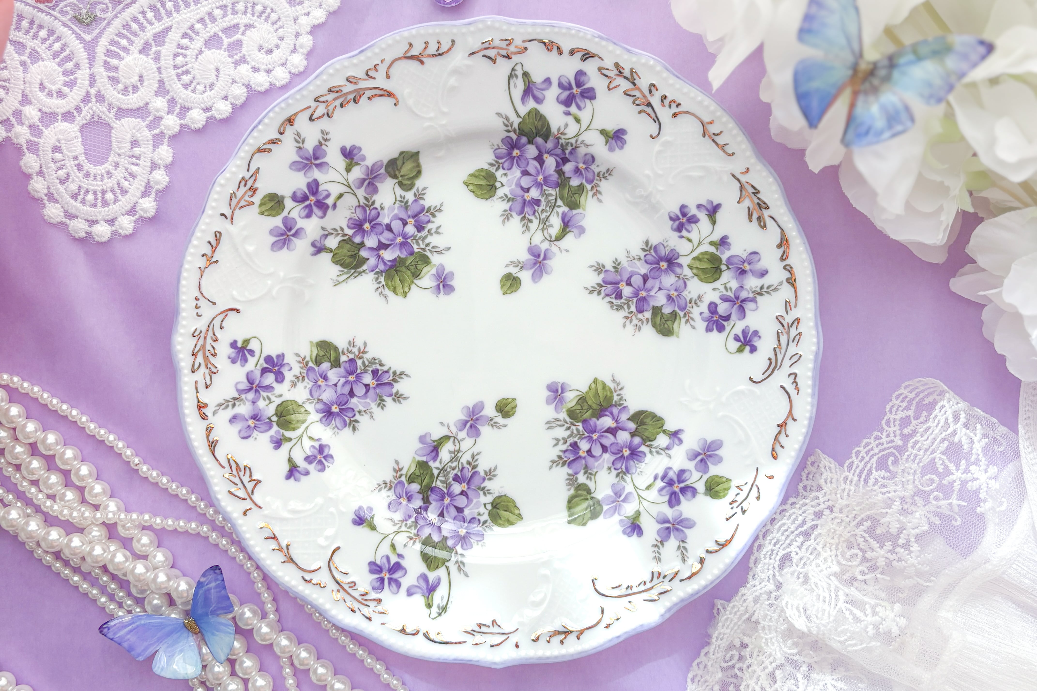 デコラティブなお皿に紫のすみれが優雅に咲き誇ります。