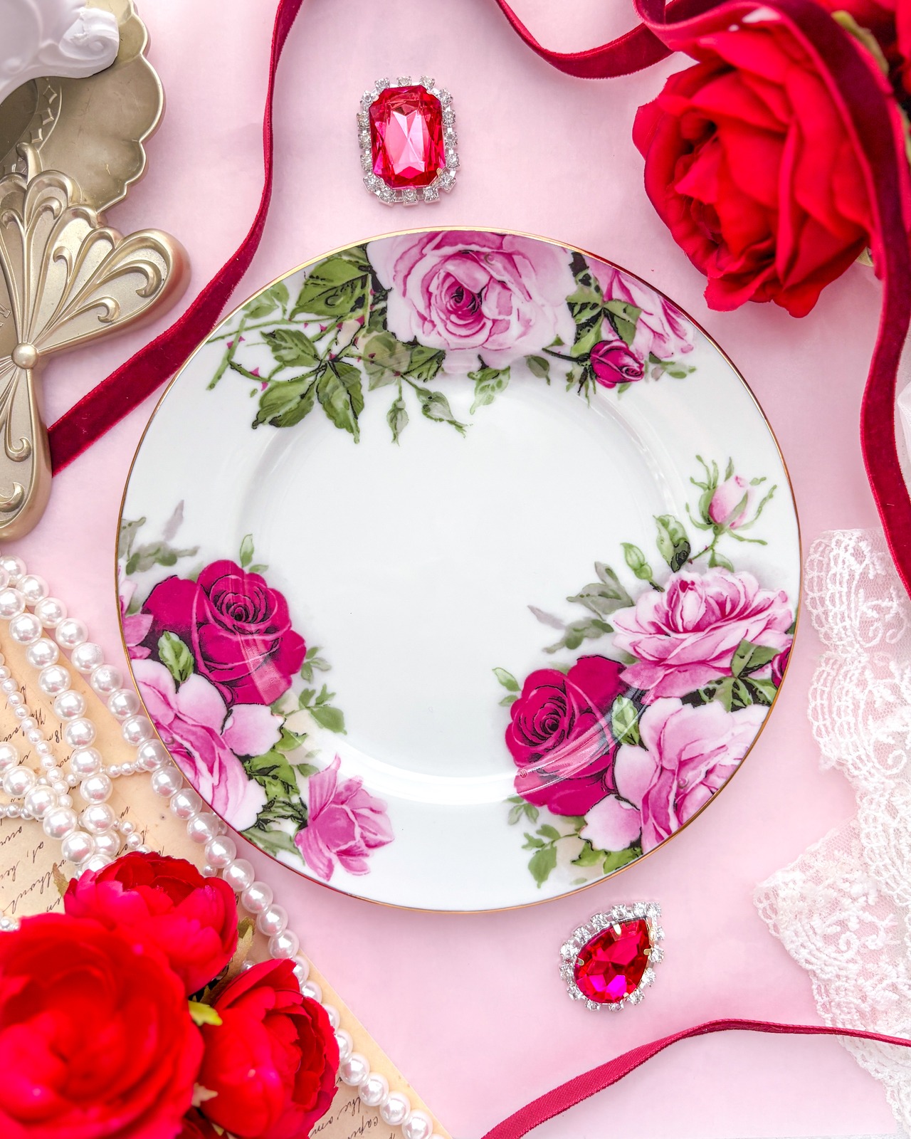 乙女心をくすぐるデザインは、お茶会やアフタヌーンティーのデザート皿、撮影小物としてもぴったりです。