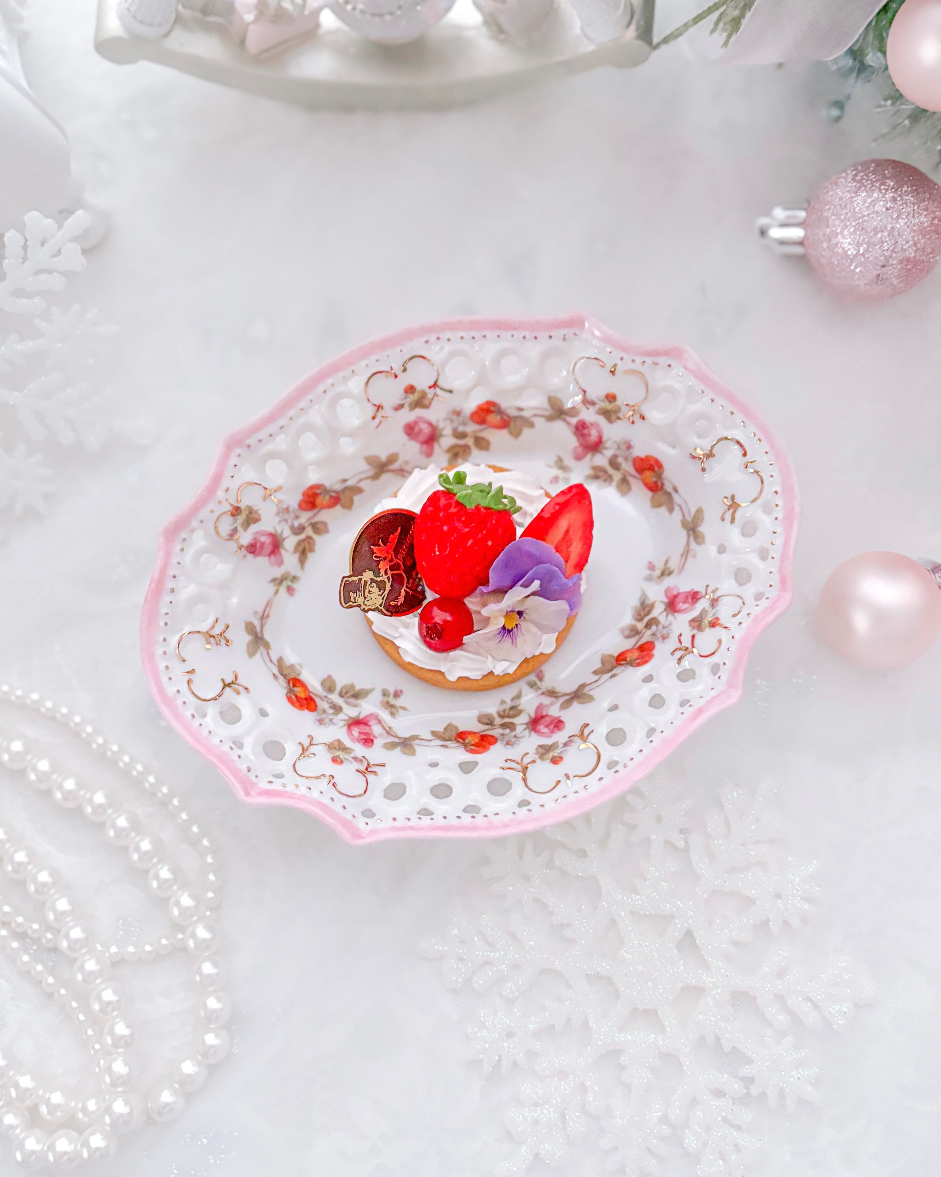 淡いピンクの縁取りと、繊細なレース模様が愛らしい小皿です。