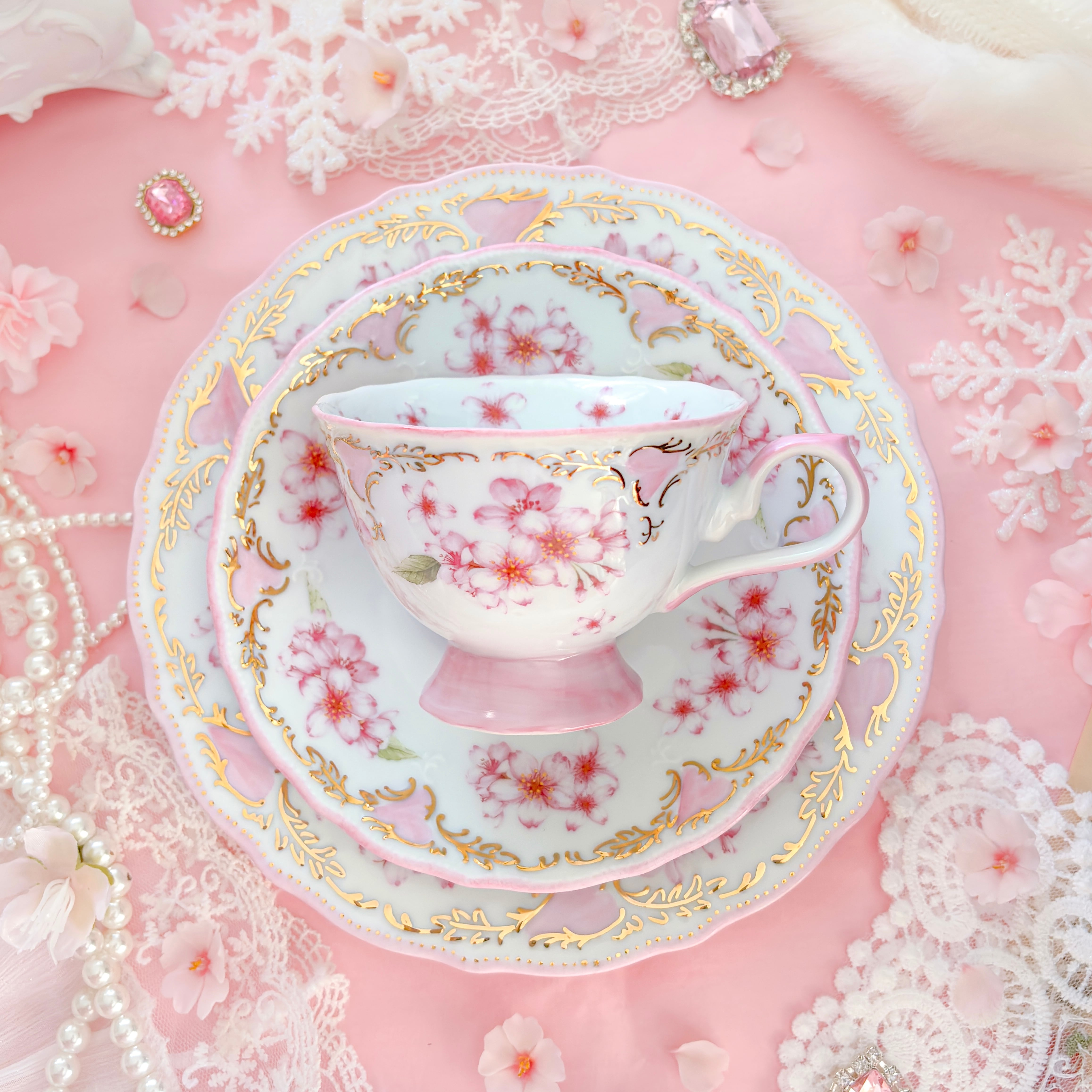 淡いピンクと金彩の繊細なレリーフが、まるでドレスのレースのように輝きます。