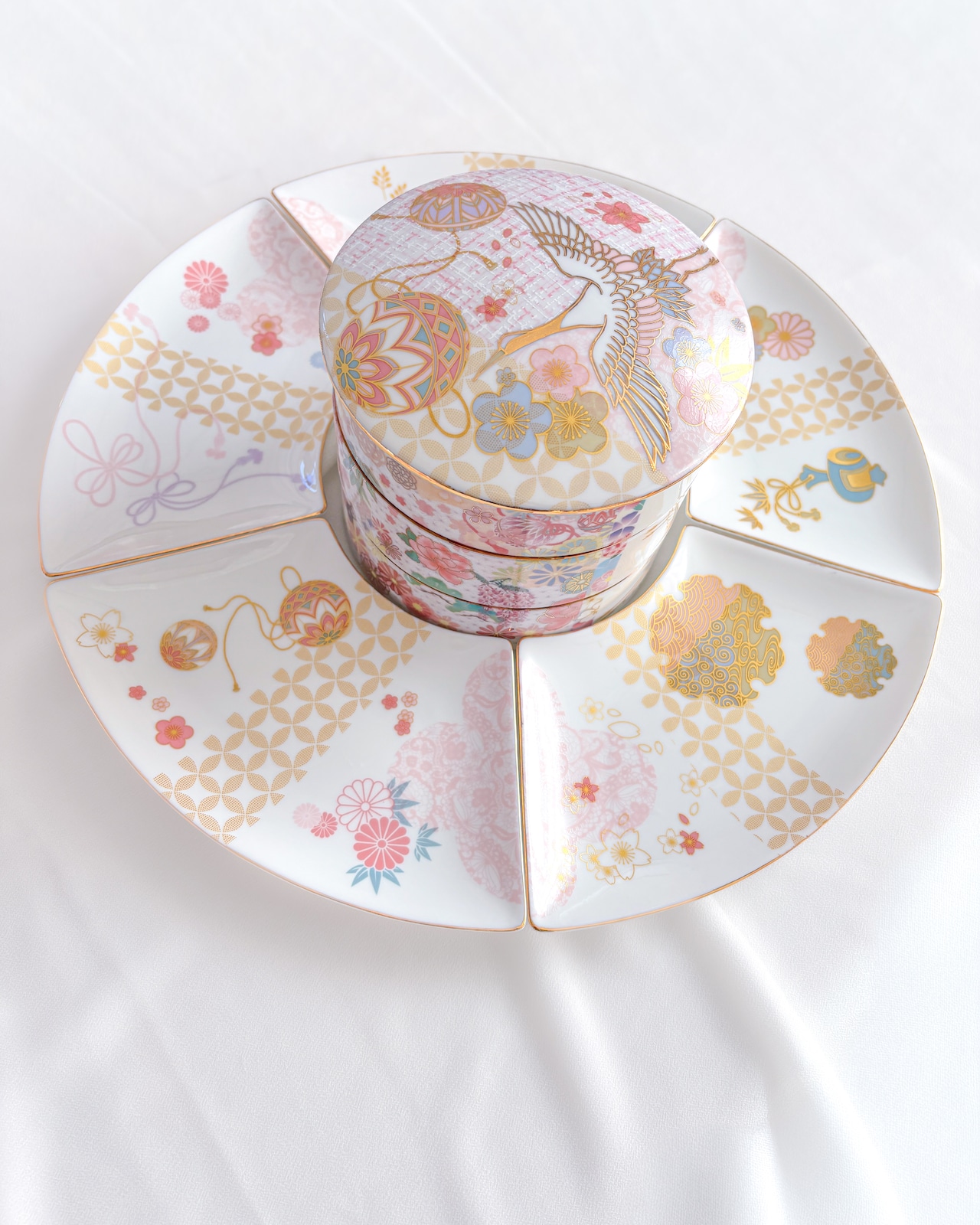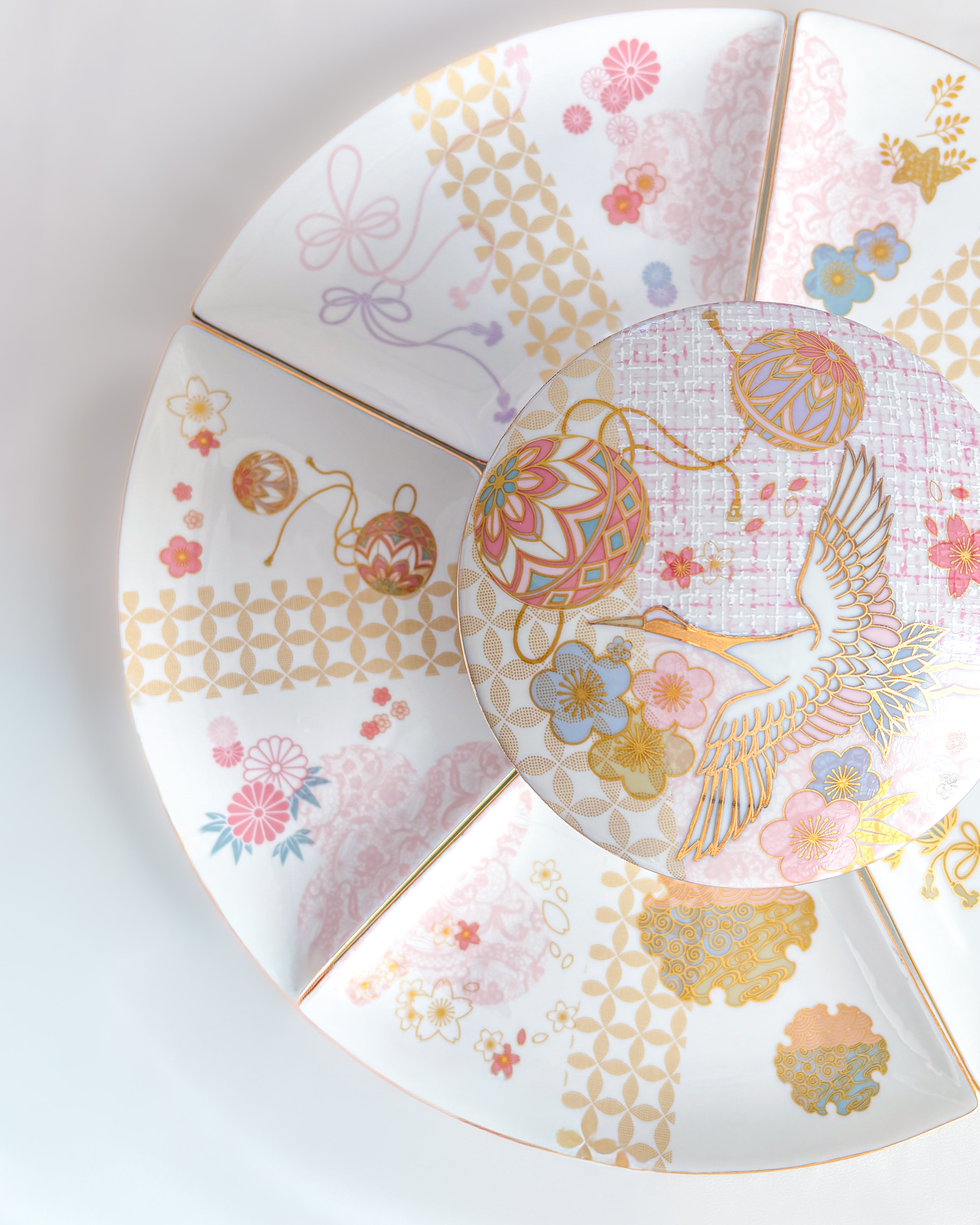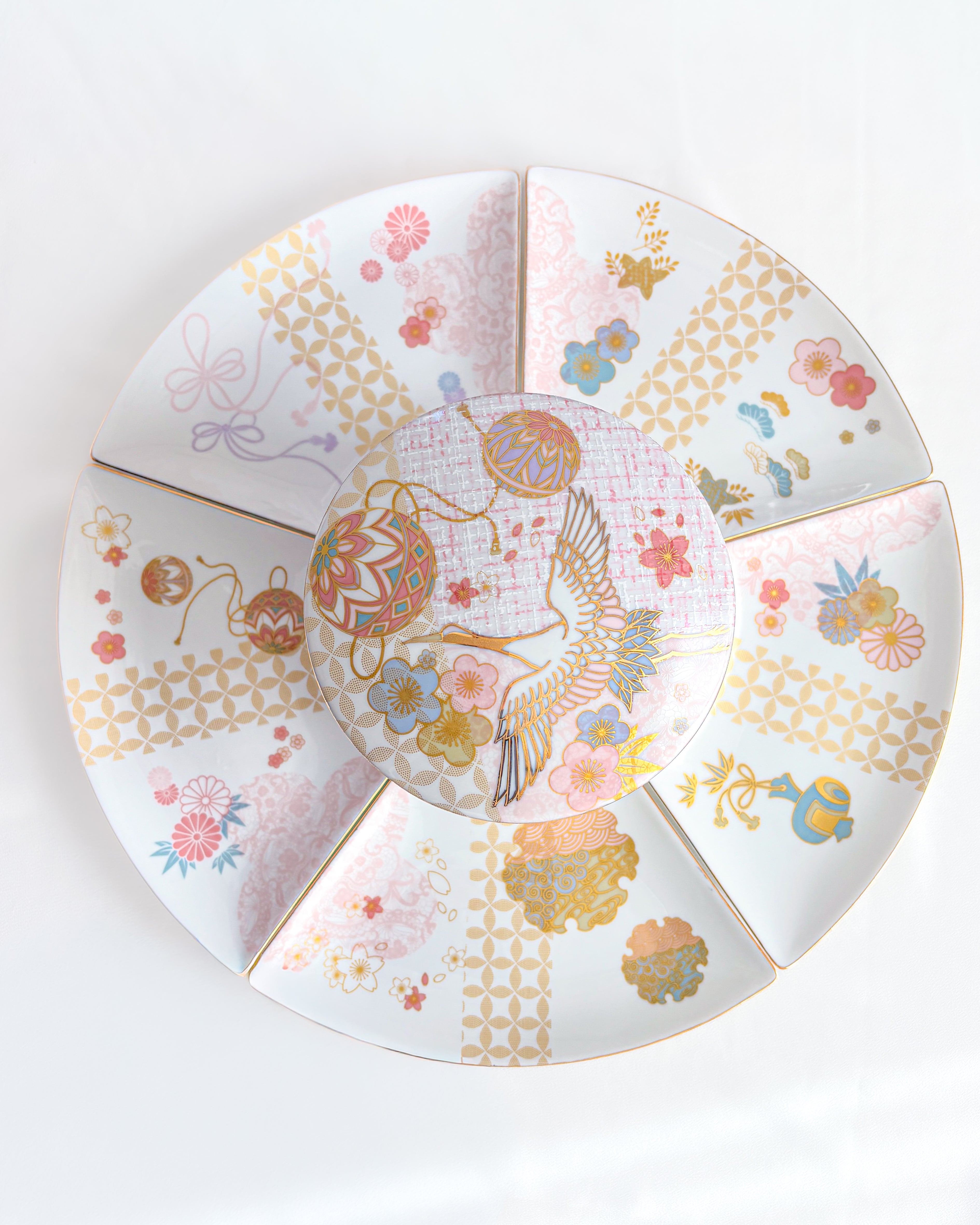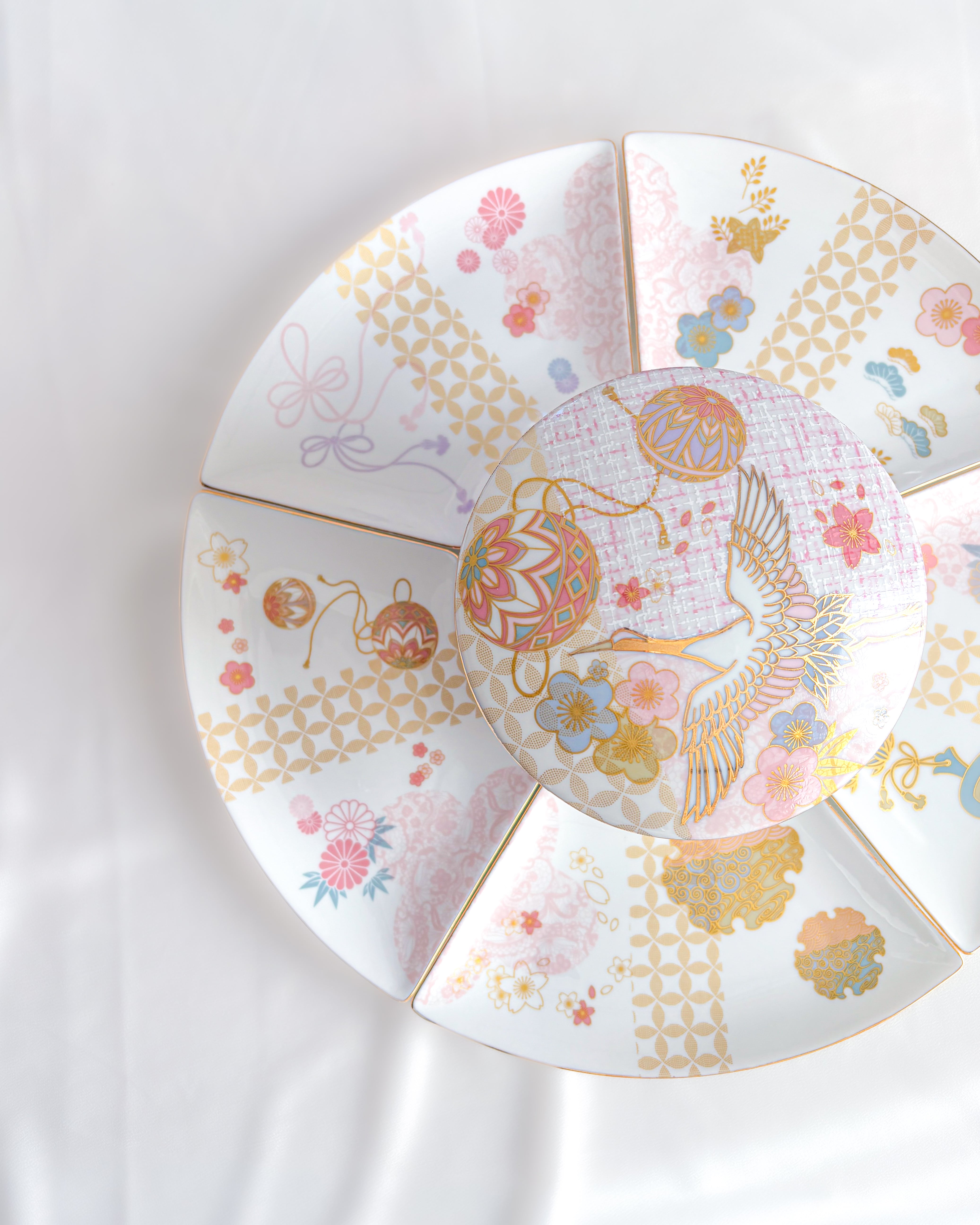 扇のお皿には梅の花や桜、鞠や、小槌、笹などさまざまなデザインを組み合わせ