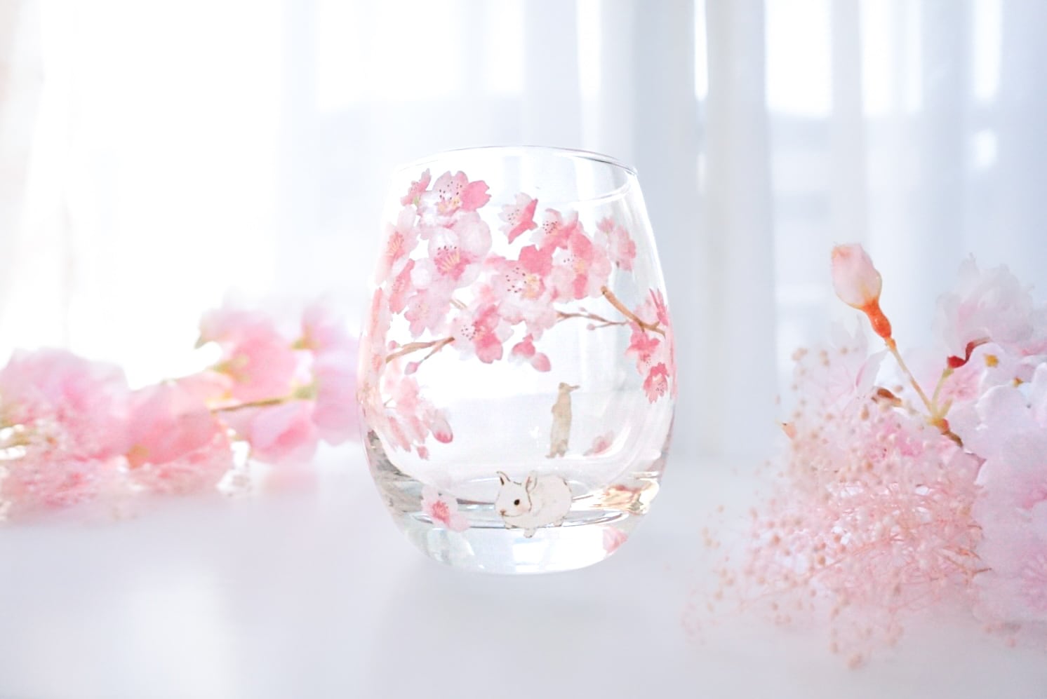 白うさぎさんと茶色のうさぎさんがとても可愛くお花見をしているデザインです。