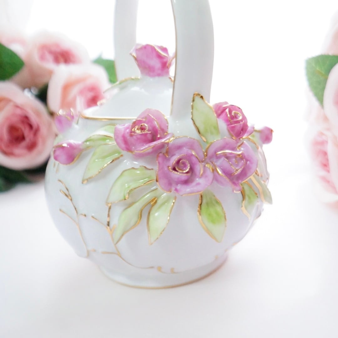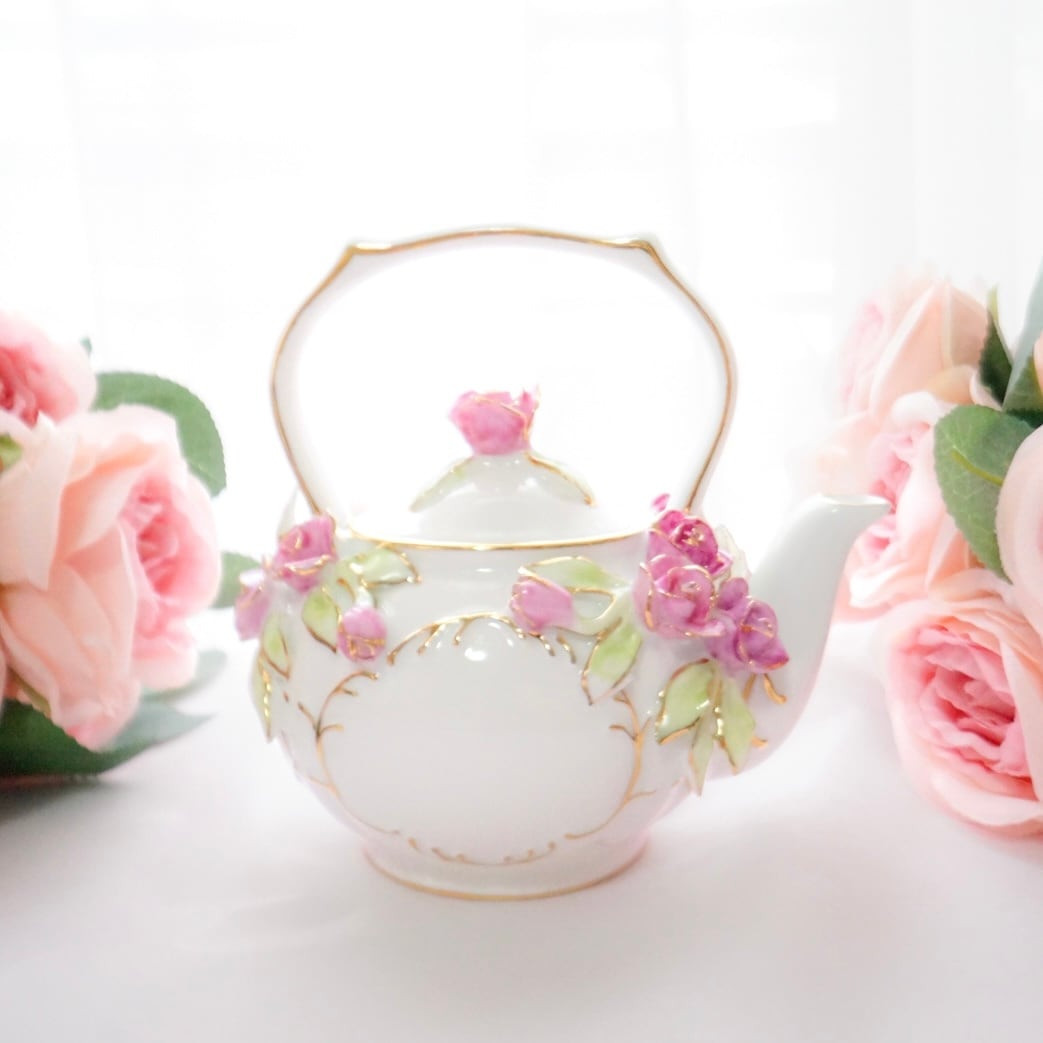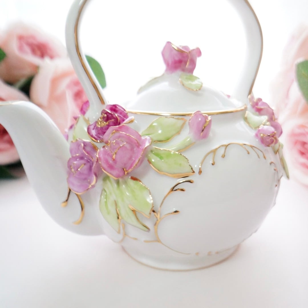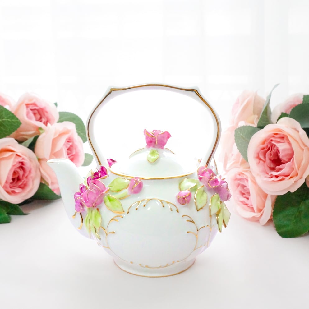 繊細な陶器で作成した薔薇をたくさん使用し、美しいティーポットを作成いたしました。