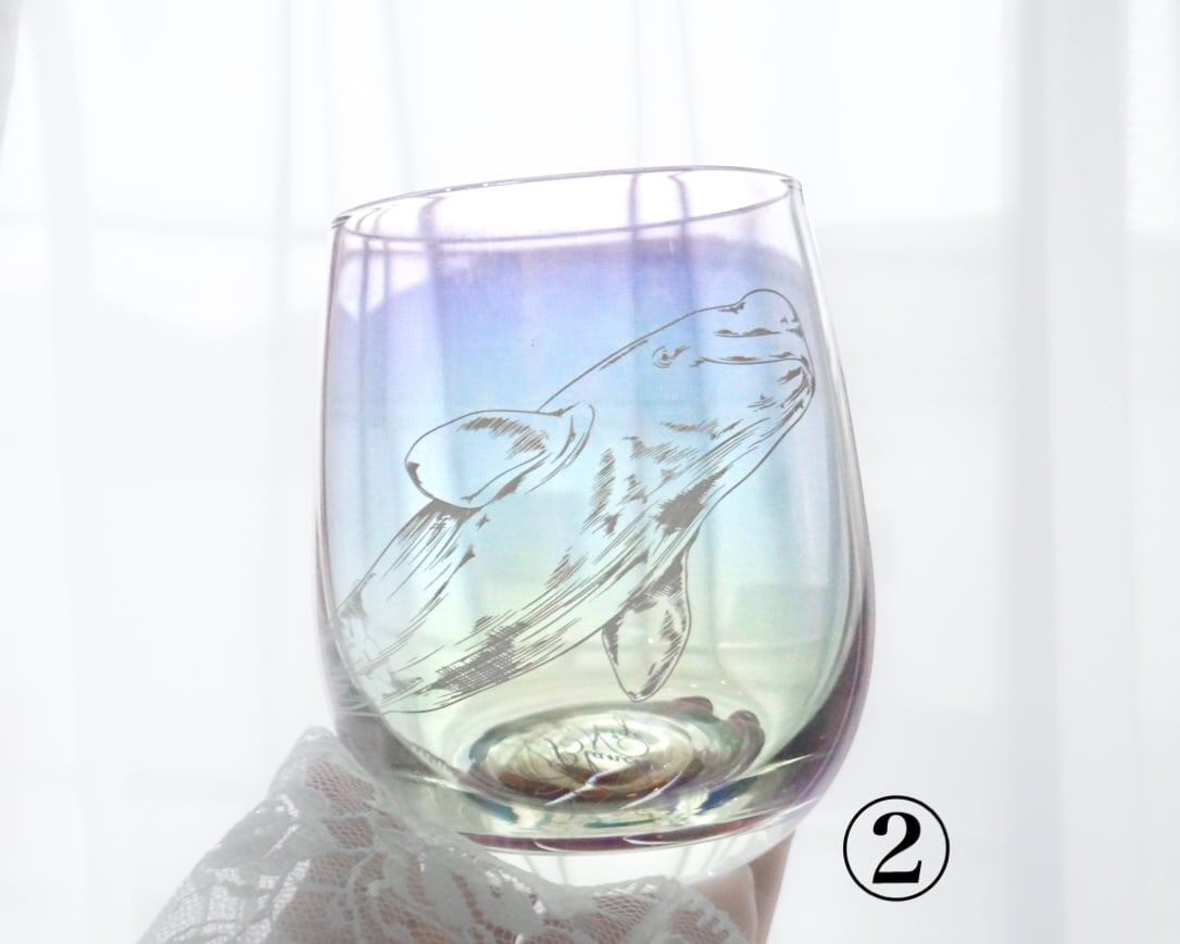 現実にはないオーロラの空を自由に泳ぐクジラをイメージし、幻想的で美しい情景をグラスの中に描きました。