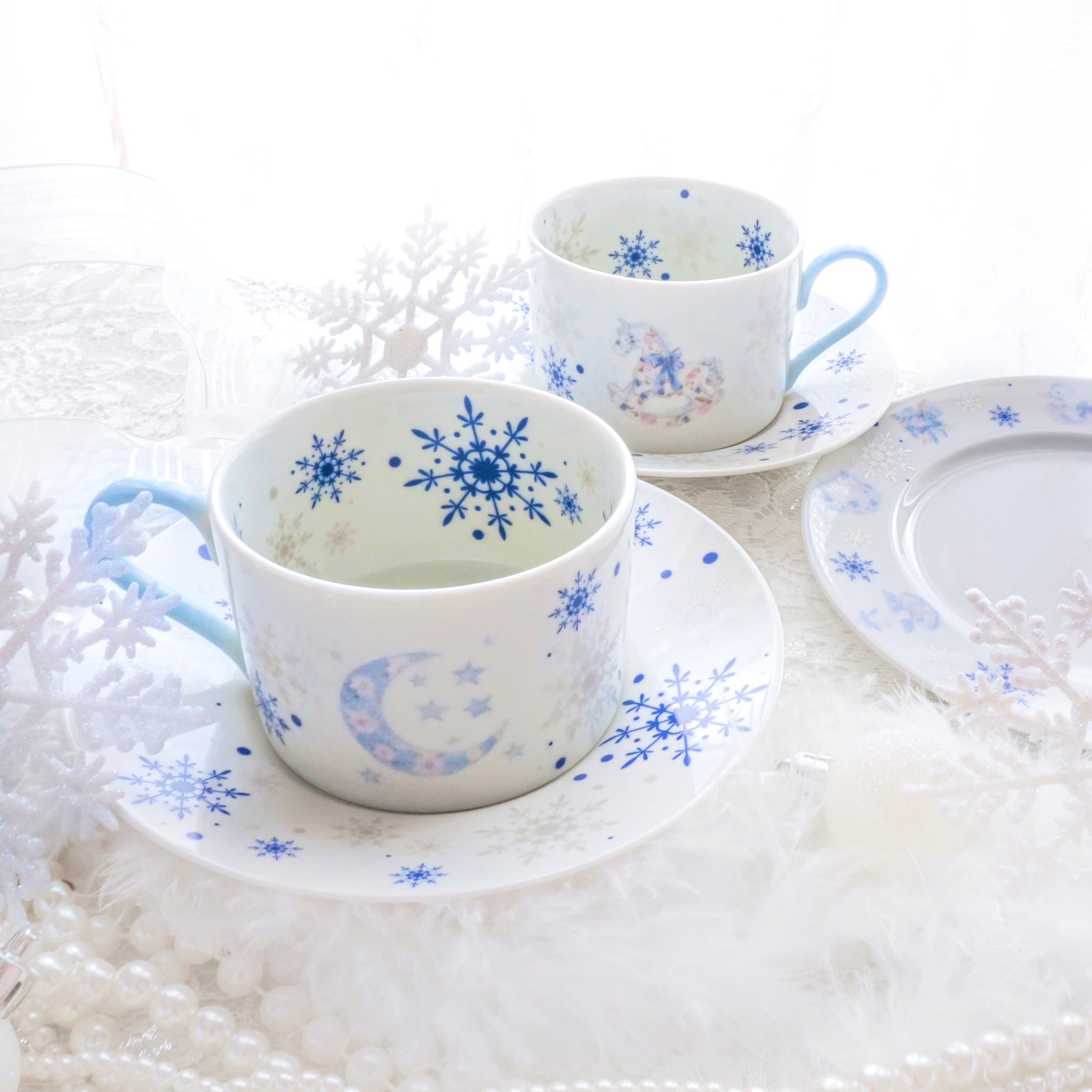 夢の中の幻想的な世界をイメージして月、くま、うさぎ、木馬などをデザインし、周りに雪の結晶が舞い、カップの中にも雪の結晶を入れ、全体的にブルーでデザインいたしました。