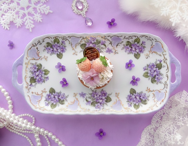 すみれが咲き集う、静かな庭をイメージして仕立てた エレガントなプレートです。 やわらかなラベンダー色のグラデーションに、 可憐なすみれの花々を丁寧に重ね、 仕上げには金彩をひとつひとつ施し、 気品ある輝きを添えました。 スイーツやフルーツをそっと引き立て、 まるですみれが咲く庭に 小さなテーブルをしつらえたような 優しいひとときを演出します。 ティータイムのおともにも、 アクセサリーを並べるディスプレイプレートとしても、 すみれの花が日常にほんの少しの“静かな可愛さ”を添えてくれる一枚です。 ⸻ サイズ 約 26.4 × 12.8 × 高さ 2.7 cm 素材 日本製 絵付け後と金彩仕上げ後の二度焼成を行い、 色の奥行きと繊細な輝きを丁寧に引き出しています。 ୨୧┈┈┈┈┈┈┈┈┈┈┈┈┈┈┈┈┈┈୨୧ • 電子レンジ不可・食洗機可 • 一点一点、絵付け・焼成を行っているため 色合いや金彩の表情には個体差があります